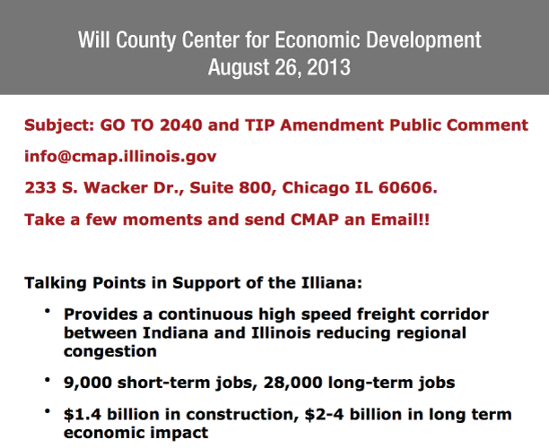 Almost a third of the 169 letters to CMAP supporting the Illiana drew verbatim from the Will County Center for Economic Development letter rehashing IDOT’s August factsheet. Many letters from municipal leaders and village boards also noted the false 28,000 jobs figured propagated by IDOT and the CED.