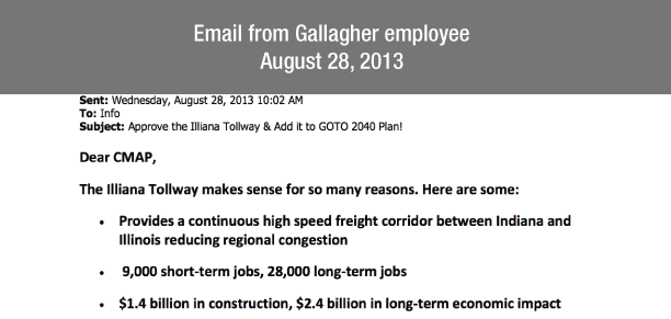 Companies like Gallagher Asphalt sent multiple letters, on official letterhead and from at least 10 staff email accounts, with “facts” copied and pasted from CED’s document. These and other letters bloated the number of comments in favor of the tollway. Even so, comments against the project outnumbered them four to one.