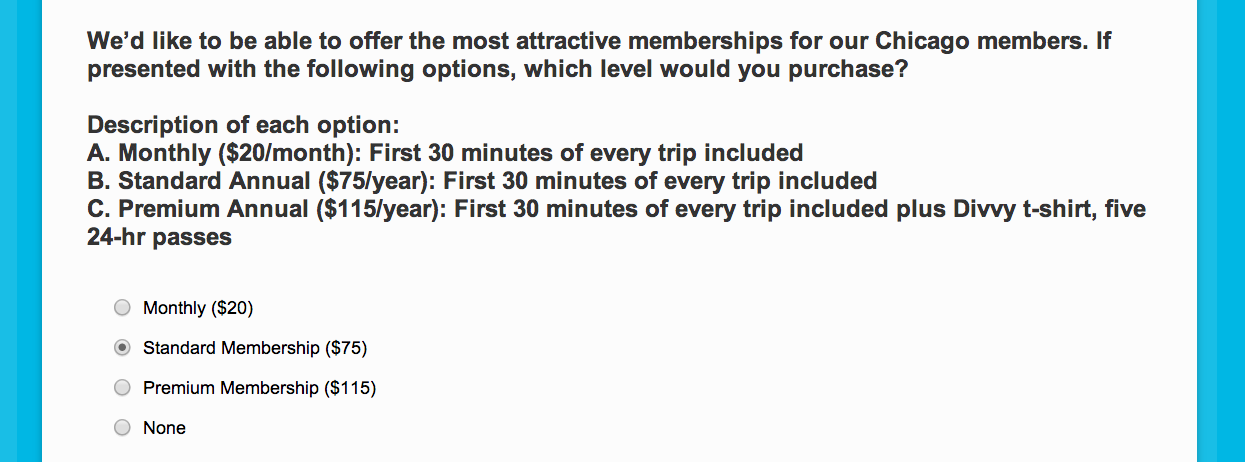 The surveys Divvy is sending vary, with different versions of the pricing questions randomly distributed, Greenberger said. The survey I completed also asked how much I would be willing to pay for a 45- or 60-minute use period without fees.