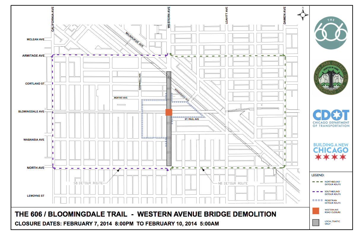 Crews will be demolishing a viaduct over Western Avenue this weekend as part of Bloomingdale Trail construction, necessitating the closure of Western and diverting automobile traffic and CTA buses to Damen and California, each a half mile away. People walking or biking will be rerouted to the underpasses a block away on either side.