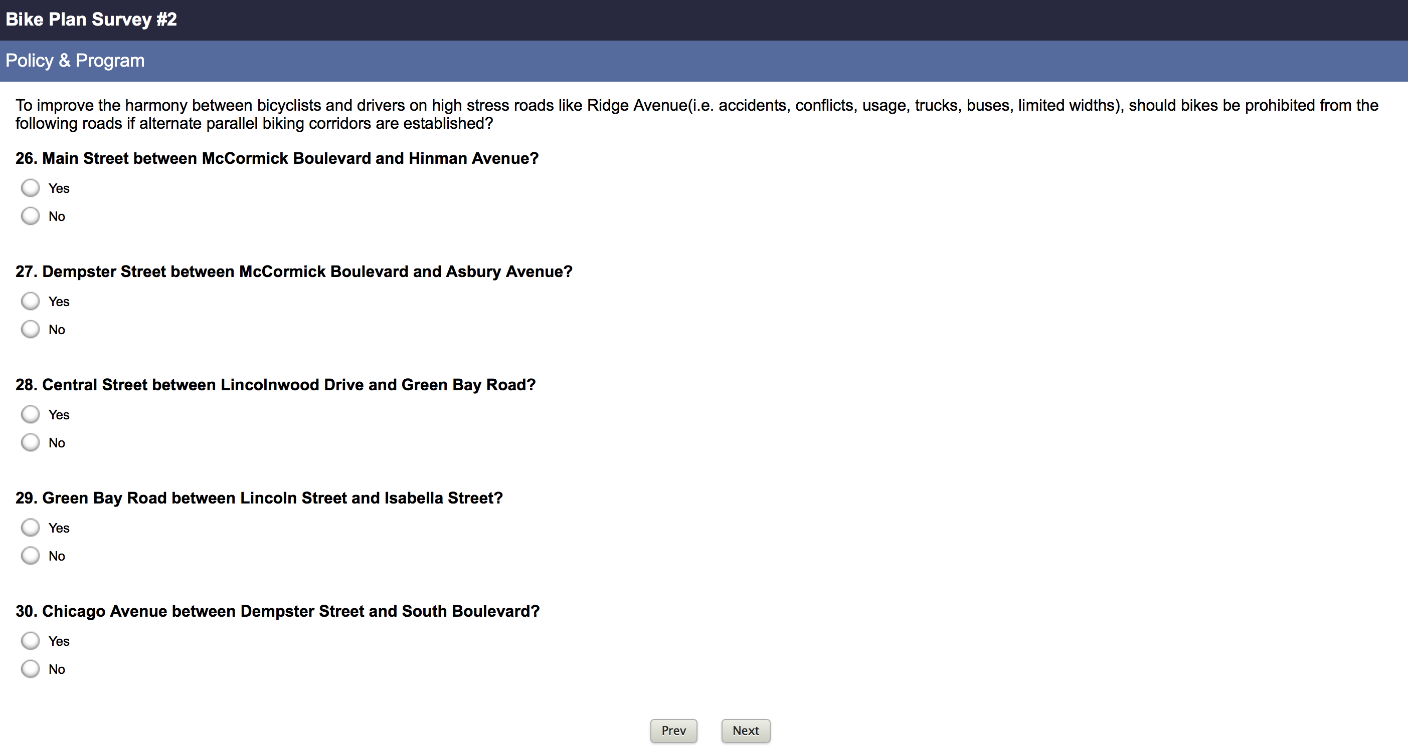 A survey to collect resident feedback about the draft Evanston Bike Plan launched yesterday, and some of the questions have alarmed residents and advocates. The survey has several odd questions, beginning with a requirement that respondents complete a quiz about bicycling laws. What truly alarmed respondents like Wheel & Sprocket store manager Eric Krzystofiak, though, is a question asking, “should bikes be prohibited from the following roads if alternate parallel biking corridors are established?”
