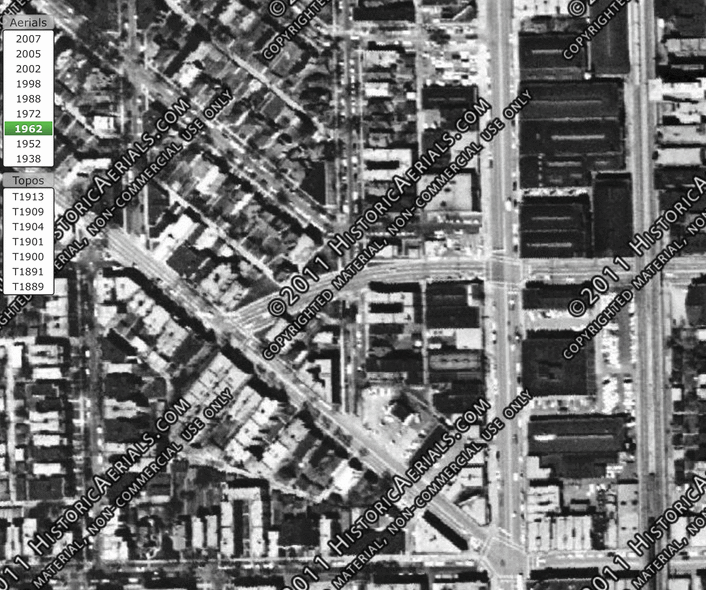 To welcome this invading army of cars, over a dozen houses were leveled in the mid-1950s (animation below) to transform these local streets into four-lane traffic sewers — roads meant to move many cars, quickly. This turned Hollywood and Ridge into impassable barriers, according to local residents like Claire Micklin. She says it’s practically impossible to use marked crosswalks, because drivers simply refuse to stop. Even when traffic backups make it possible to get halfway across, fast-moving traffic thunders past in the other direction. Micklin says she dreads trying to cross, or even to walking alongside the streets — since parking is banned, the never-ending traffic runs right next to the sidewalk: