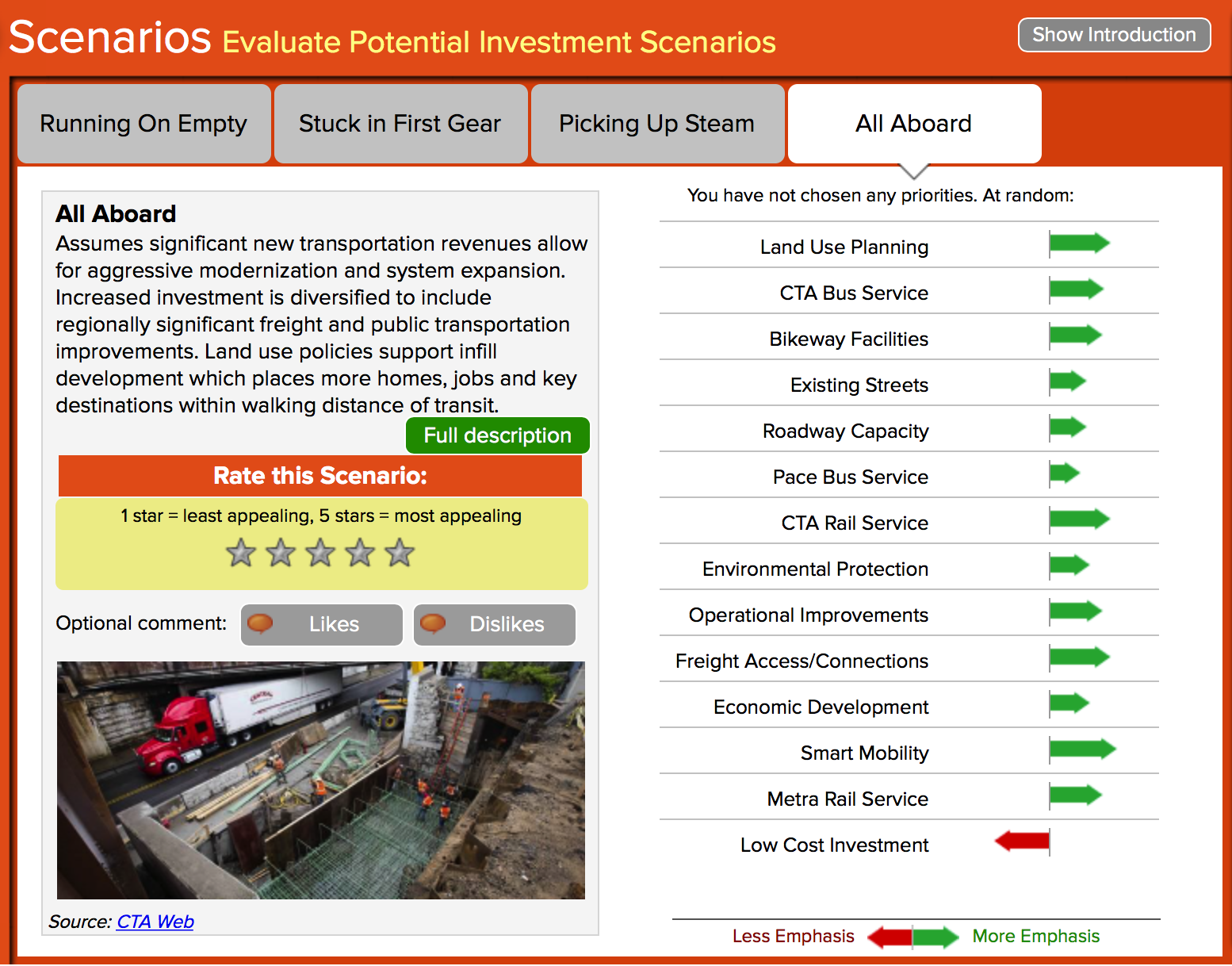 Earlier this year, Cook County embarked on its first transportation plan since 1940, asking residents to weigh in on how and where to improve transportation across the second most populous county in America. That feedback has helped the transportation department to draft a new vision statement [PDF] – that world-class transportation will spur economic growth and enhance quality of life – plus four scenarios for the future [PDF], which the public can vote on in an online survey.