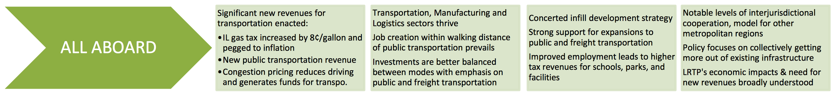 The final scenario, “All Aboard,” is one which supposes additional funding and new development surrounding existing transportation resources. Specifically, it assumes that the state gas tax will be raised by eight cents per gallon, and pegged to inflation. Policy changes would target county revenues towards compact and mixed-use development on infill locations, and expand regional transit “to reach underserved destinations.” Building within existing neighborhoods is a core tenet of GO TO 2040, and focusing new spending there would stabilize neighborhoods and expand businesses.