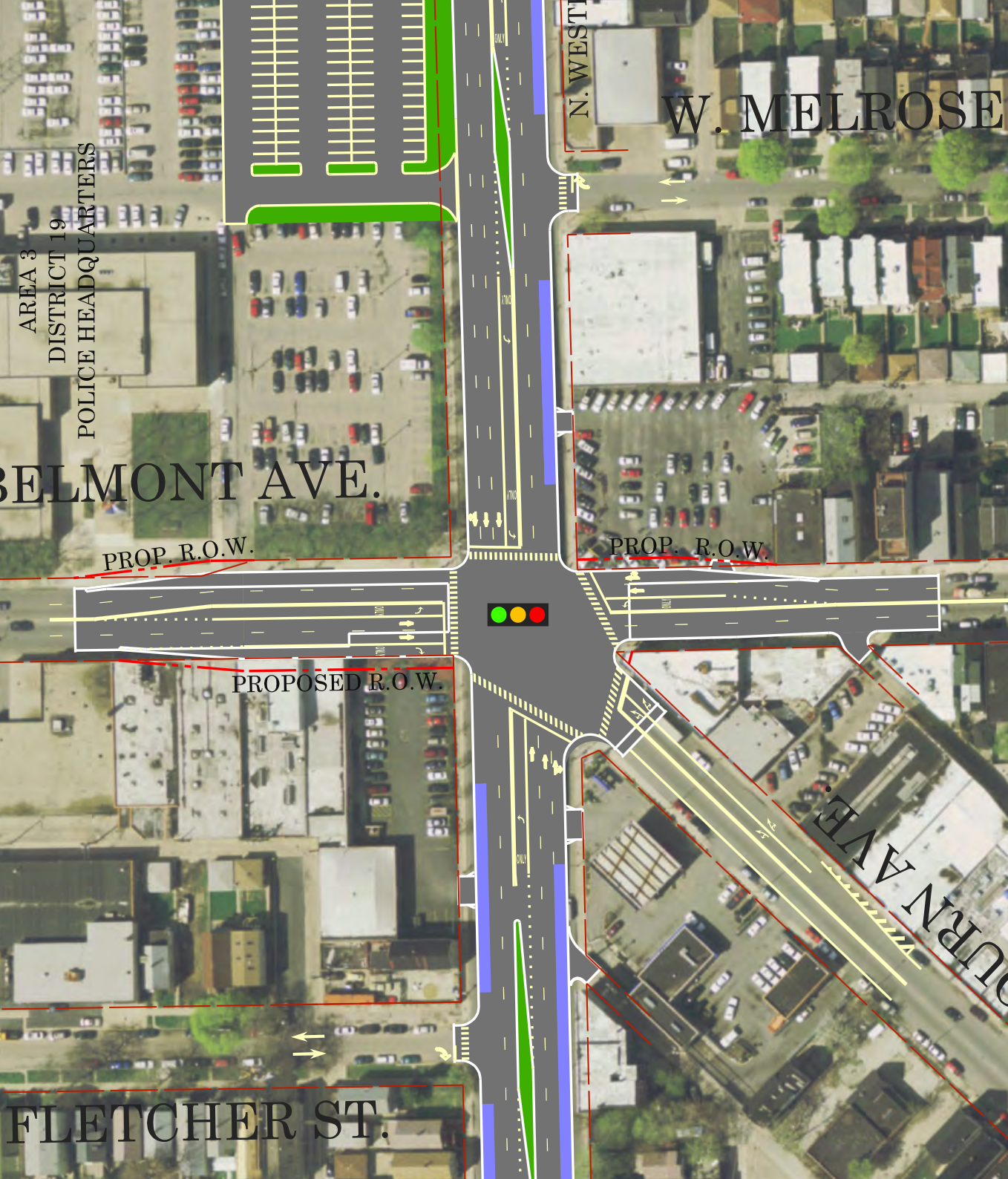 However, bike facilities were explicitly excluded from this project, since “Western is the dominant street when considering design requirements, and the narrowing (reduction) of Belmont [travel lanes] cannot occur,” Walsh said. In other words, since Belmont has four lanes today, it must always continue with at least four through lanes, plus new turn lanes to let cars roll through even faster.