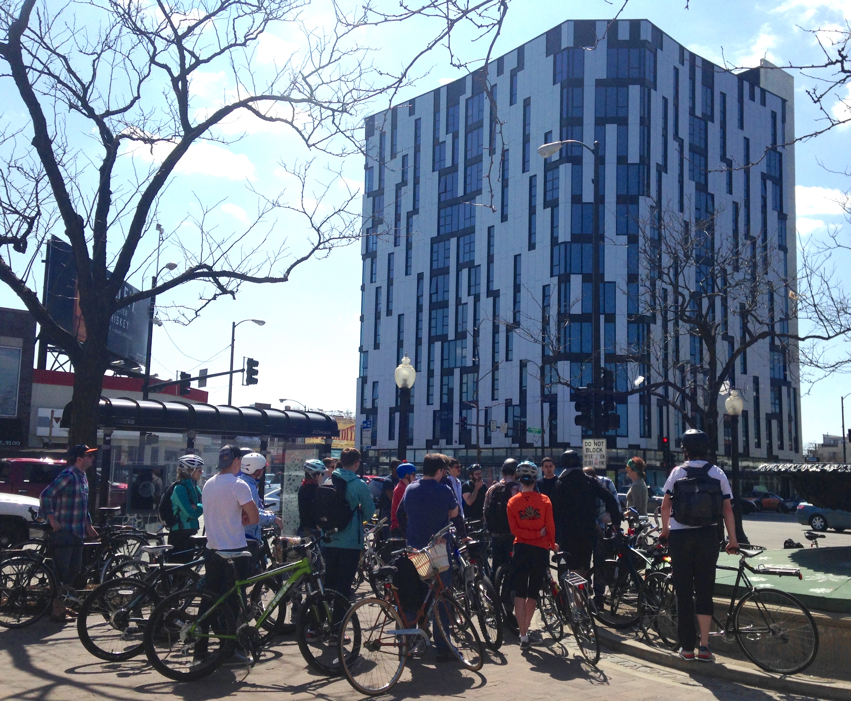 A score of Streetsblog Chicago readers joined John Greenfield and me last Saturday to pedal to 12 sites where developers are taking advantage of proximity to train stations by building dense housing with fewer parking spaces than usual. The buildings, in different phases of approval and construction, are all near Chicago Transit Authority ‘L’ stops.