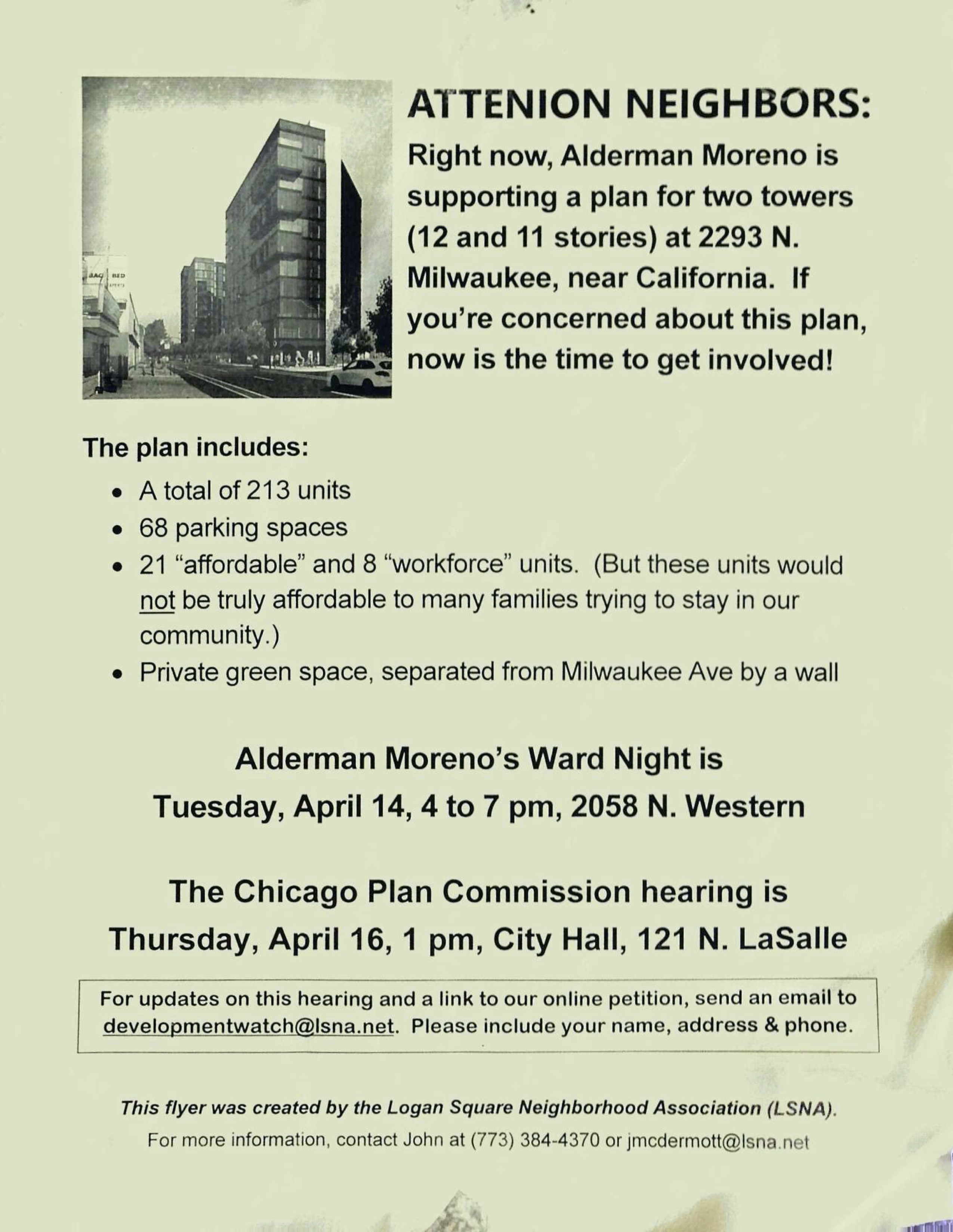 The latest flyer, from the Logan Square Neighborhood Association, encourages residents to show up for First Ward Alderman Joe Moreno’s ward night this evening and a Chicago Plan Commission hearing on Thursday at 1 p.m. in City Hall. Currently, there are competing petitions about the 2293 project: one asks Moreno to delay the hearing, and one asking him not to.