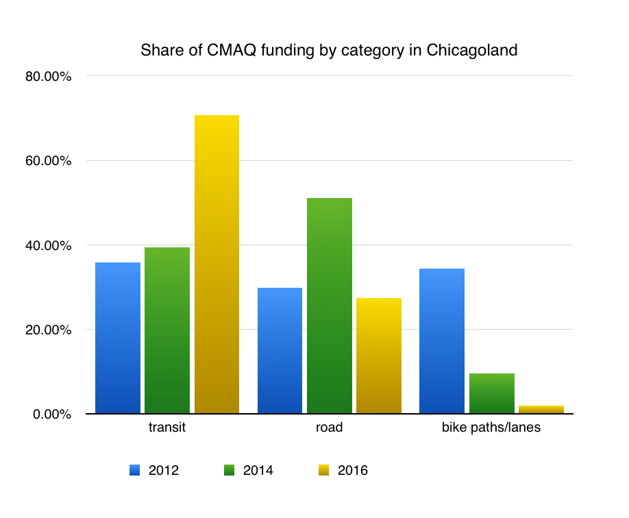 The CMAQ funding program has been essential to building needed bicycle and transit infrastructure, and the CMAP committees and board must continue to reducing the share of road and driving projects while working with municipalities to design good projects.