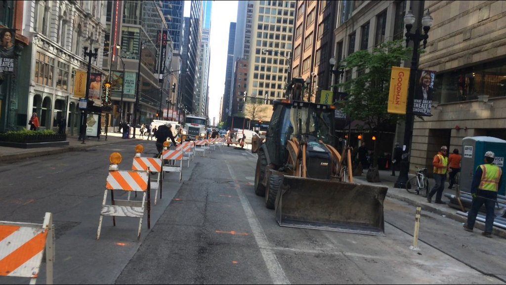 I notified the Chicago Department of Transportation, which reviews detour plans before permitting construction sites. CDOT spokesman Mike Claffey couldn’t confirm today if the contractor was following an approved detour plan. Streets with protected bike lanes, like Dearborn, also have a special step in the permitting process “to ensure proper reinstallation of all bicycle facility elements.”