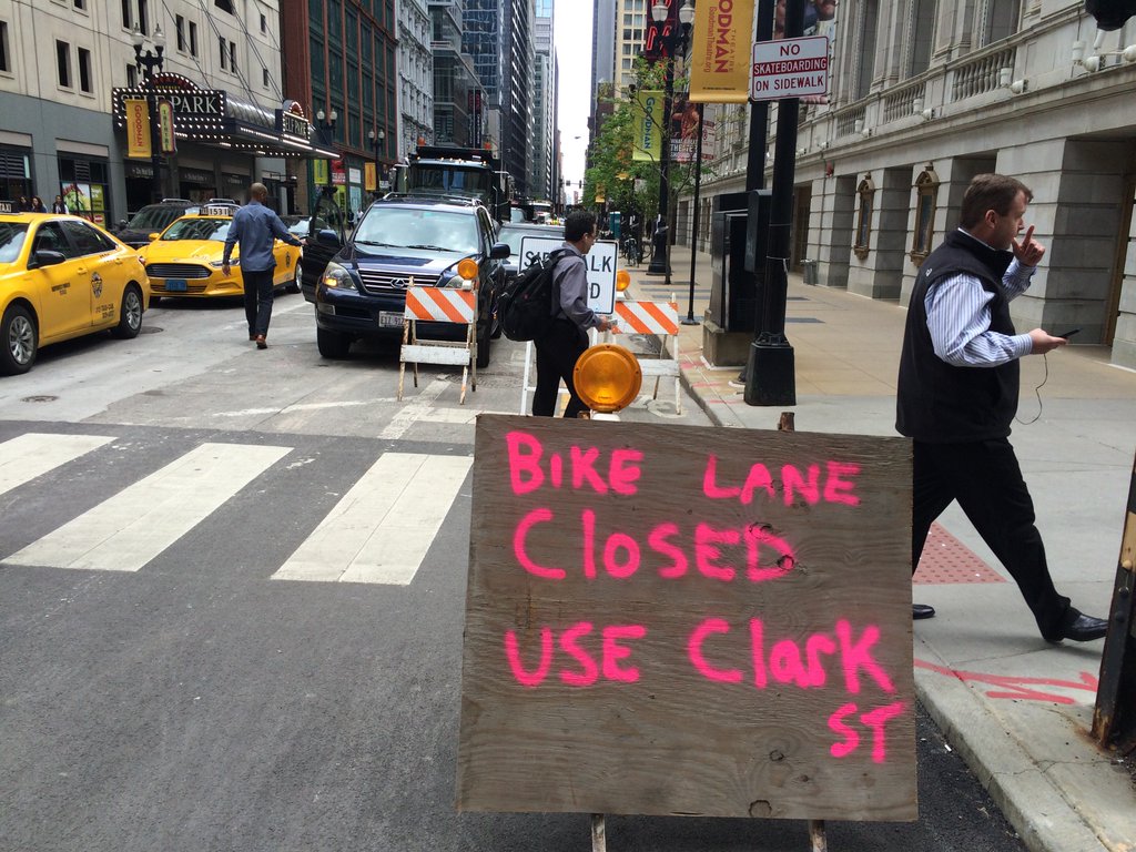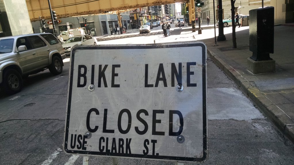 Yesterday, a hand-painted sign on Dearborn, just south of Lake Street, said “Bike lane closed – use Clark St.” But any reasonable person would see why this is foolish. To follow these directions, a bicyclist would have to head the wrong way against eastbound traffic on Lake Street to reach Clark, or else use the sidewalk.