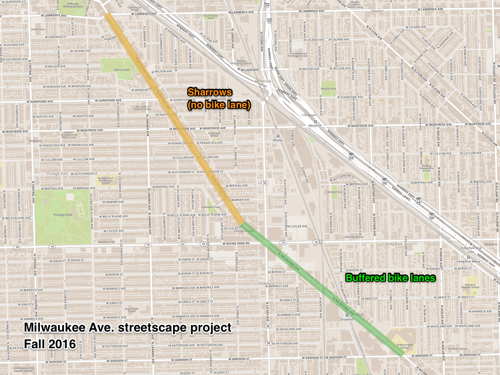 Since Milwaukee between Addison and Irving doesn’t have enough right-of-way for parking on both sides, travel lanes and buffered bike lanes, CDOT recently did eight parking studies on this stretch to see how many spaces were actually being used. The department found that, since this segment has little retail, and much of the housing has off-street parking, curbside spaces were seeing little use. In addition, the absence of metered parking makes it relatively easy to strip parking.