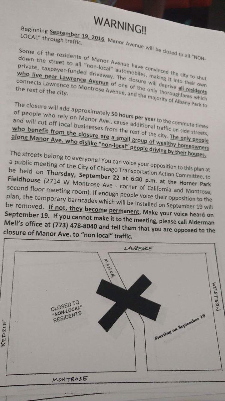 The Chicago Department of Transportation’s proposal for a neighborhood greenway on Manor Avenue is endorsed by 33rd Ward alder Deb Mell and the ward’s Transportation Action Committee (I am a member of the TAC). But the initiative is facing fierce opposition from some Ravenswood Manor neighbors who object to plans for traffic diverters at Manor and Wilson Avenue that would eliminate cut-through traffic on Manor.