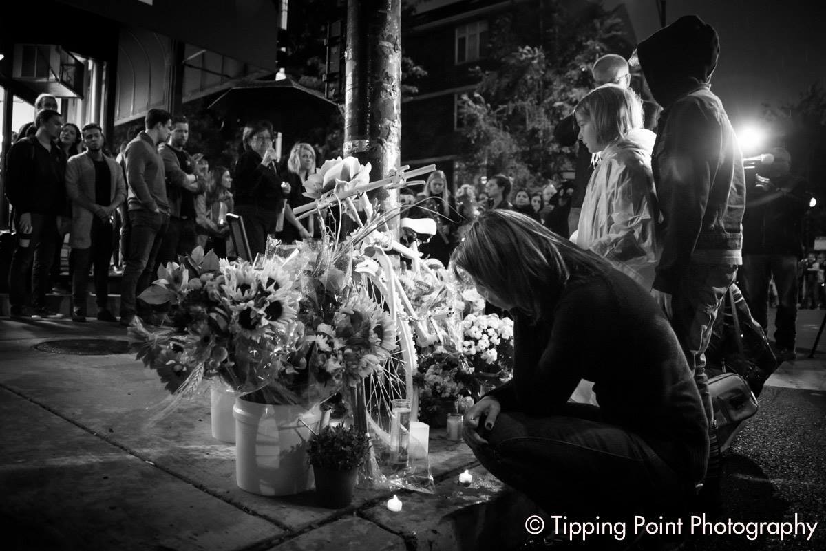 Over 300 people came to the intersection of Addison Street and Damen Avenue in Roscoe Village yesterday evening to pay their respects to Anastasia Kondrasheva and her family, friends, and coworkers. There were so many people that a handful of police officers diverted east-west vehicle traffic while letting CTA buses pass the somber scene.