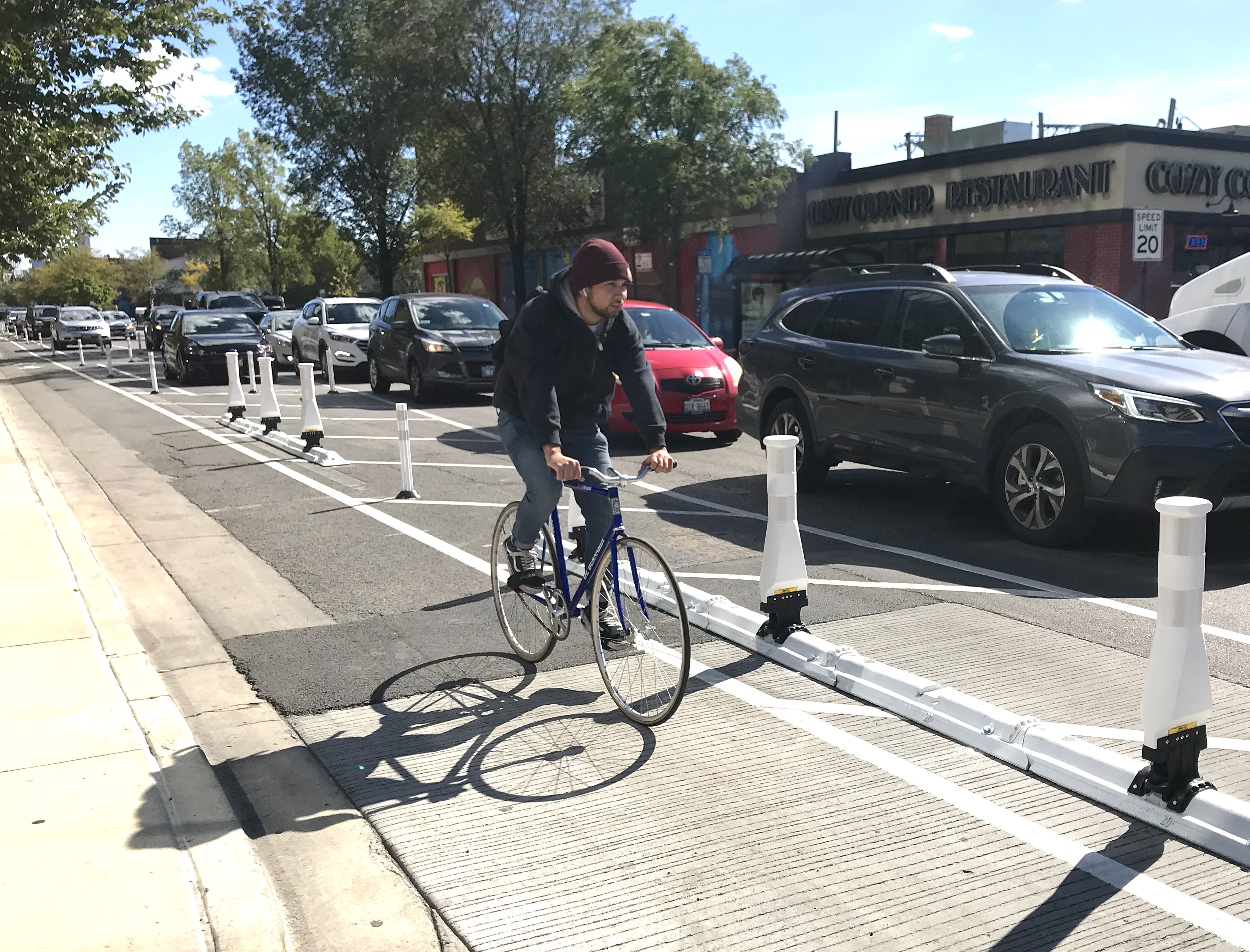 The new Milwaukee improvements are costing about $340,000 altogether, according to CDOT bike and pedestrian program manager Dave Smith. The department had to purchase the Qwick Kurb plastic curbs and bollards, rather than having the company donate a sample of the product for the pilot. Smith didn’t provide an estimate for how much it would have cost to do the same stretch with concrete curbs, but indicated that it was significantly cheaper and faster, taking “weeks instead of months.”