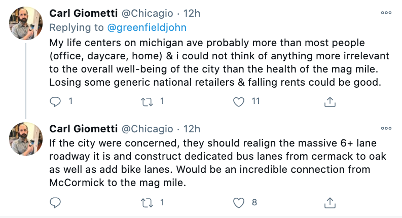 Various experts Marotti interviewed said the solution to Michigan Avenue’s waning fortunes is to do more to make spending time there a unique experience you can’t get from shopping online. Suggestions included indoor and outdoor galleries and installations, live theater, street performers, and outdoor dining. They also pointed to the need for more pedestrian space, ala New York City’s Times Square makeover. These are all good ideas.