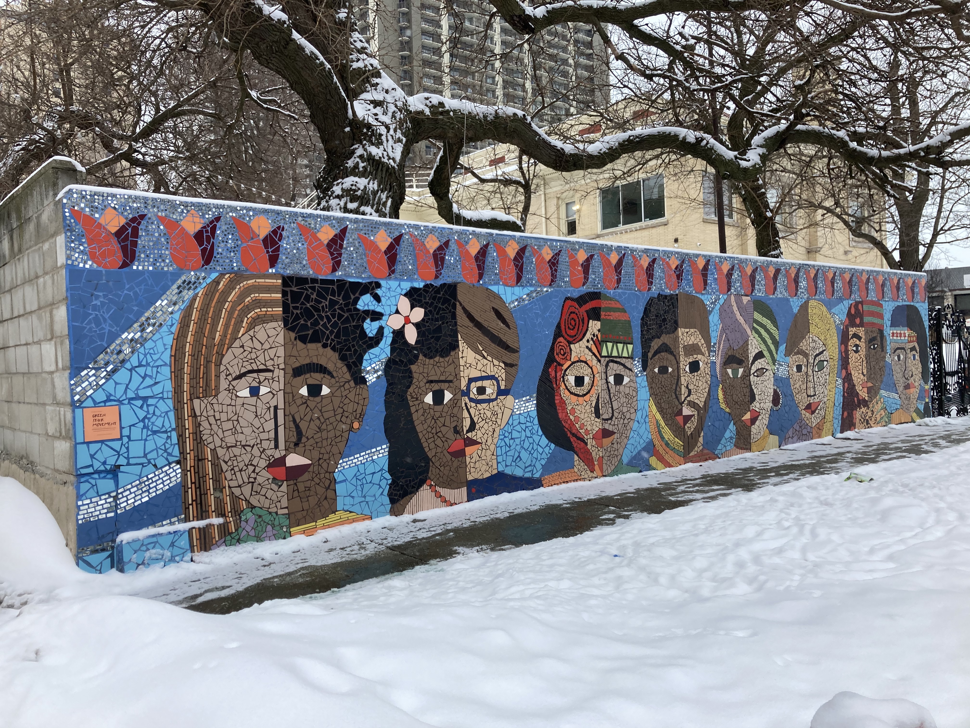 Approaching the 47th Street bridge, I see a couple of teens flop down in the snow and then recline there for a while, gazing at the sky. By tiny 49th Street Beach, there’s a comfort station covered with a colorful mural of faces, flowers, and seagulls. Continuing towards Hyde Park, there are lots of University of Chicago students and families out enjoying the sunshine.