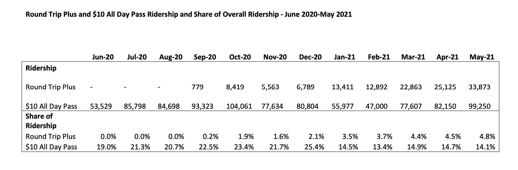 According to statistics provided by Metra, Round Trip Plus use went up significantly between September and October 2020, both in terms of percentage of overall ridership and actual numbers, going from 0.2 percent (or 779 riders) to 1.9 percent (8,419 riders). The numbers dipped in November 2020 as Illinois saw a rise in COVID-19 cases and hospitalizations, to 1.6 percent (5,563 riders). While the number of riders using the passes shifted up and down in winter and increased through spring, in terms of percentage of overall riders, the numbers have increased consistently December 2020, going from 2.1 percent to 4.8 percent of overall ridership.