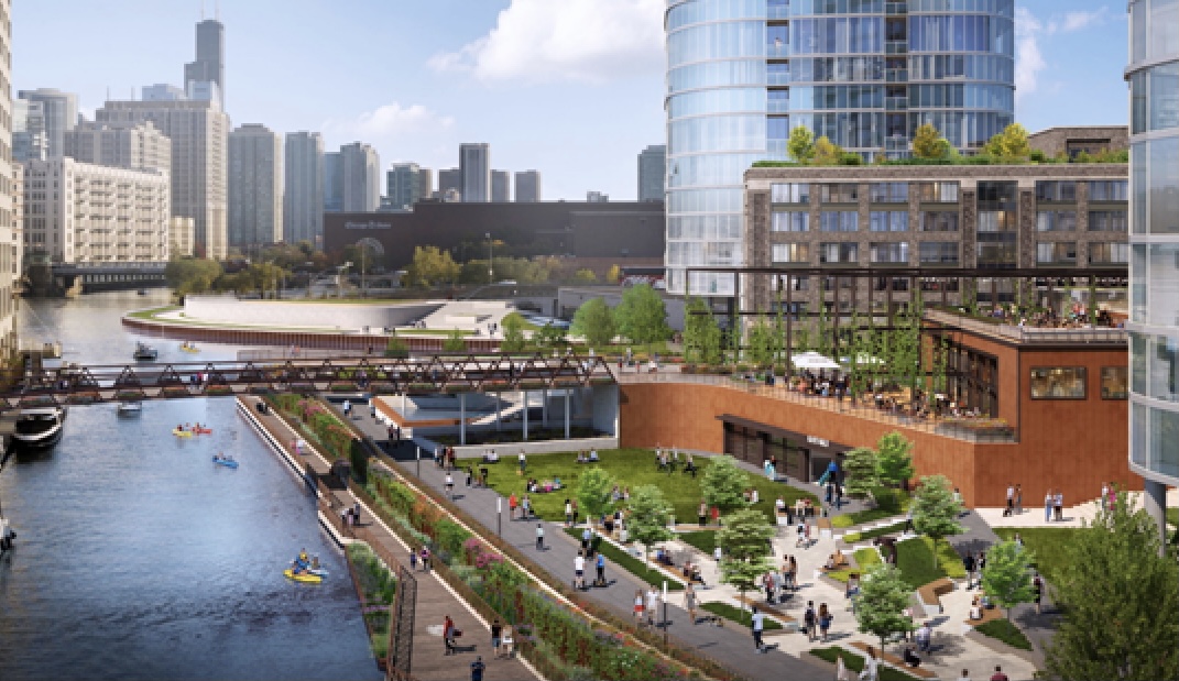 Image above: The 901 N. Halsted St. development is set to include new bike trails and integrate with Chicago’s ‘wild mile’ along the river.