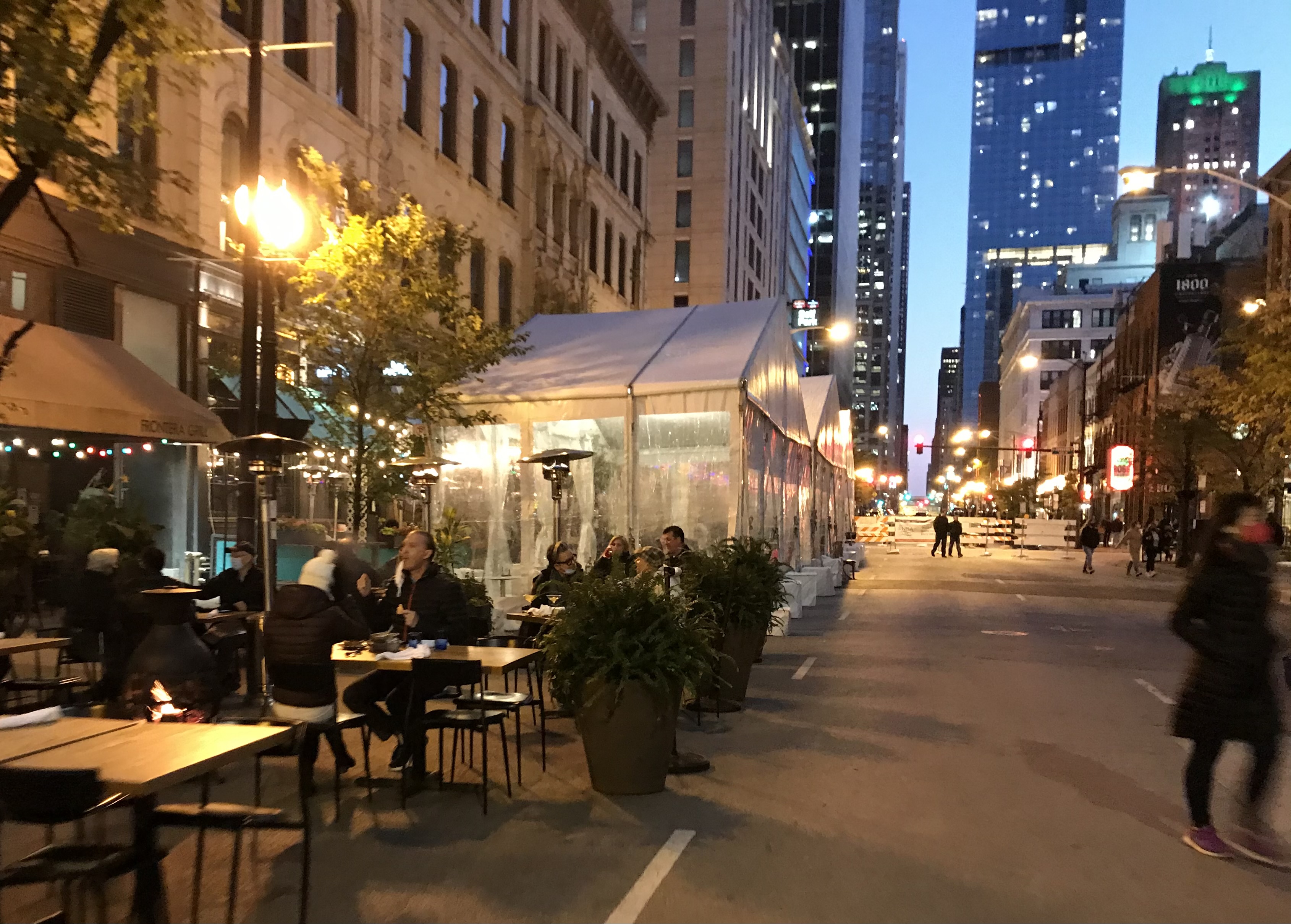 One outlier has been the three-block stretch Clark Street between Grand Avenue and Kinzie Street, home to popular eateries like Beatrix, Ema, Frontera Grill, and RPM Steak. (There’s also a cannabis dispensary on this block that uses the extra roadway space for queuing customers under a shaded canopy who would otherwise be waiting on a narrow sidewalk.)