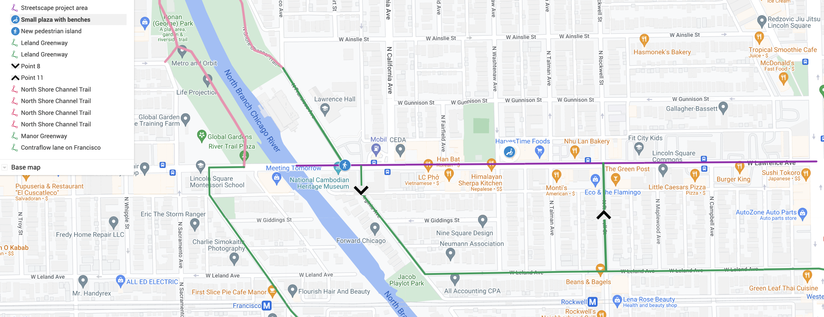 Perks for people on foot will include wider sidewalks, new wheelchair ramps and crosswalks, curb bump-outs to shorten pedestrian crossing distances, and a pedestrian island at Francisco, which will also make it easier to get to and from the contraflow lane. The project also includes new community identifiers, street lighting, parkway trees, parkway pavers, and a new “community gathering space” – a small plaza with a few benches – at the northeast corner of Lawrence and Washtenaw (2700 W.) avenues.
