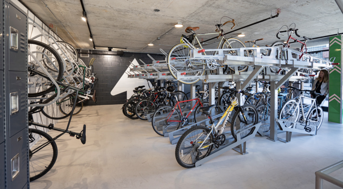 Wolf said the developer decided to install the bike counter, manufactured by Eco Counter, as part of several sustainable transportation initiatives associated with AMLI 808. The building, located a stone’s throw from the Chicago Avenue Brown and Purple ‘L’ station, is a transit-oriented development with 318 apartments but only 16 car parking spaces. It features a two-story bike room with over 300 parking spaces, four lockers for electric bikes and non-standard-size cycles; automatic doors on the first floor; a repair stand; and an air pump. AMLI also sponsored a Divvy bike-share station next to the building, and the building construction project involved widening the Wells sidewalk
