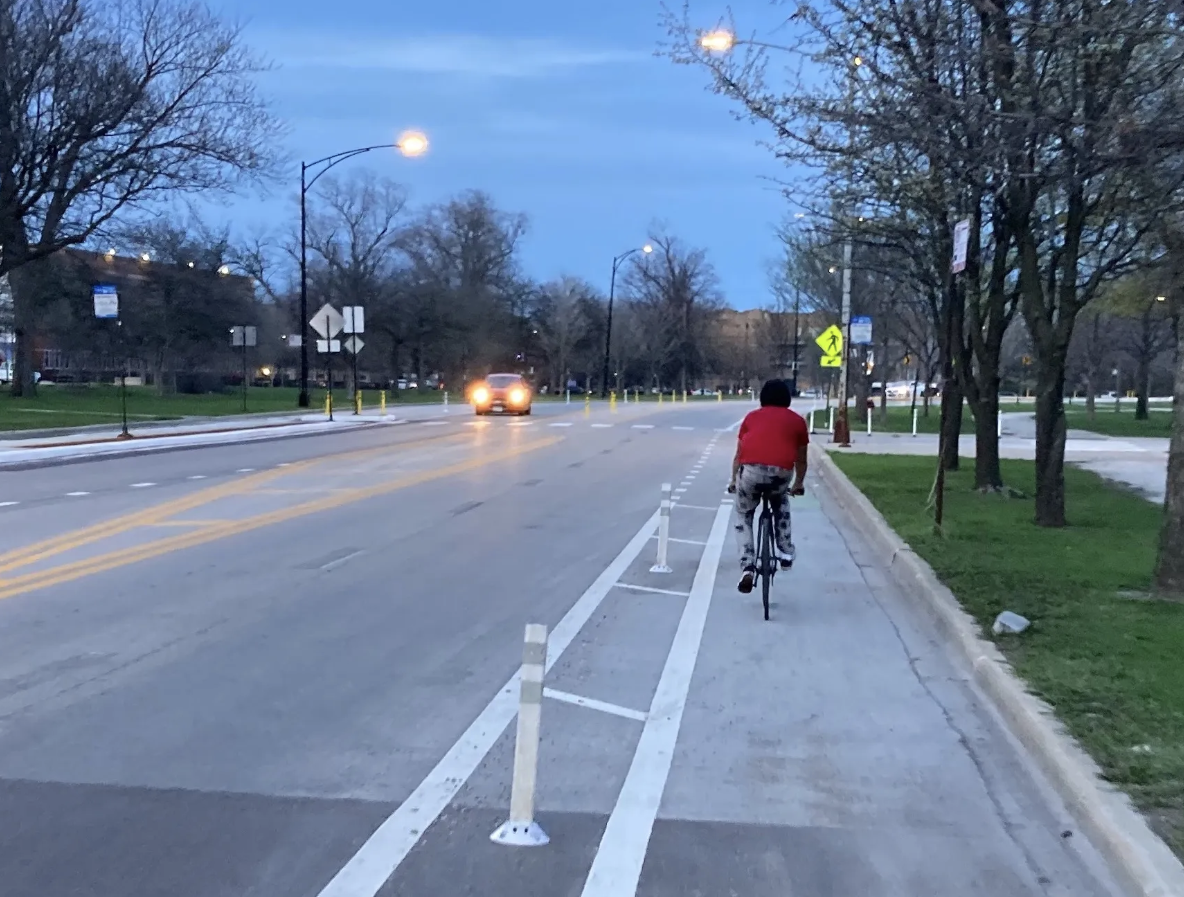 As mentioned above, the third pillar of CDOT’s plan, “streets free from violence,” is tragically far from realization. However, the strategic plan update included a few bright spots. There’s the road diet that reduced Jackson Boulevard through Austin’s Columbus Park from four lanes to three and added bus-boarding islands and protected bike lanes, a redesign that reduced speeding by 75 percent.