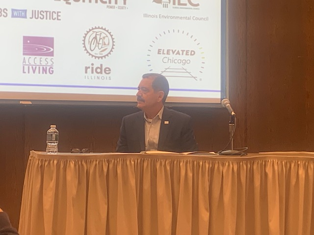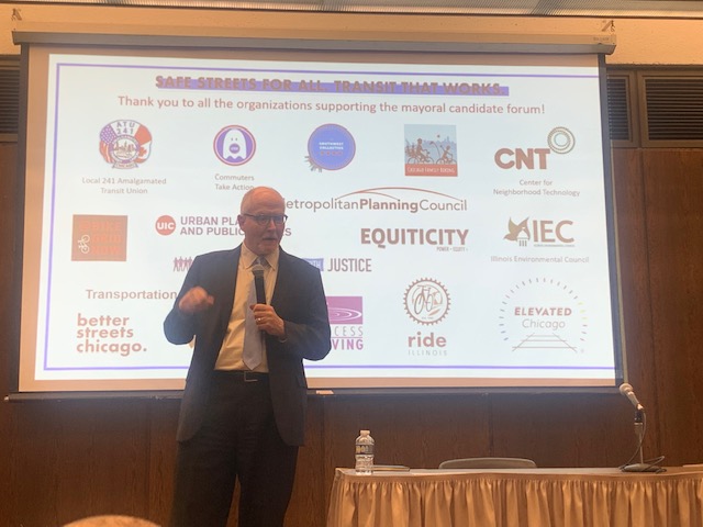 Ex-Chicago Public Schools CEO Paul Vallas spoke next, and didn’t get past the first question. He foregrounded his comments by stating that transportation isn’t his strongest subject and, if elected, would reach out to experts and community members for guidance. Vallas also blamed crime for decreased CTA ridership and said he would like to divert the recently earmarked $101 million in CTA funding for private unarmed security guards to increasing police presence on trains and platforms. He then talked about his plan to provide water filters for Chicagoans to protect against lead poisoning.