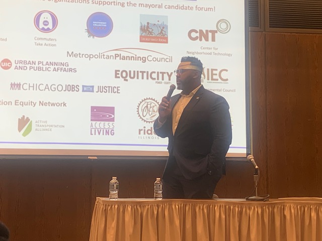 Green, an entrepreneur and activist, was asked how he would address the CTA’s workforce shortages. Green stated that public transit should be “safe, clean, fast and, at some point, free.” He said that he would declare a state of emergency on transit to “free up funds” that would be used deploy social workers to trains. He also proposed resource kiosks at CTA stations. Green said that CTA workers should have down payment assistance for purchasing homes and free college tuition, making these jobs more attractive to young people entering the workforce. When asked about bridging equity gaps between North and South side CTA transit hubs, Green emphasized the importance of building affordable housing near transit and, interestingly, called for more public-owned grocery stores. He also stated support of Chicago Bike Grid Now’s agenda of making ten percent of Chicago’s streets bike-priority and challenged the other candidates to do the same.
