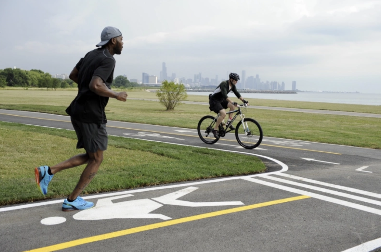 The candidate argued that the pavement markings on the Lakefront Trail that were added as part of the recent project to create separate bike and pedestrian paths is “really inadequate… On the Lakefront Trail you’ll see areas where you as a pedestrian are being asked to look for cyclists [by text on the pavement reading “Look Bikes.”] This is the wrong order. Pedestrians should be prioritized over cyclists.”