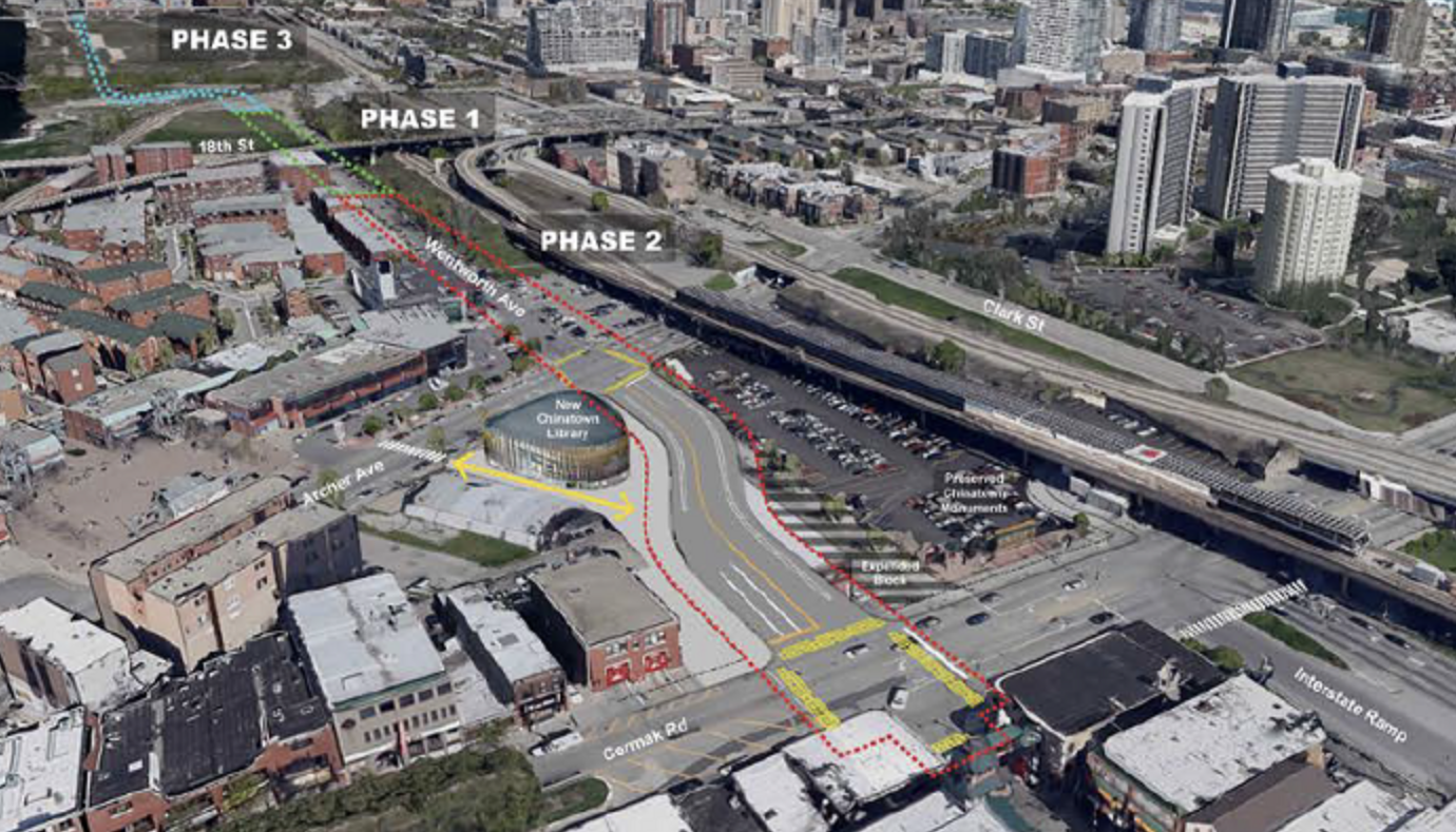 According to a project webpage for the Wells-Wentworth Connector, the new road “will allow for improved traffic flow throughout both [The 78] by creating a coordinated series of intersections, as well as provide or improve pedestrian connectivity within the [megadevelopment] and to nearby destinations such as the new Ping Tom Park fieldhouse, the… Chinatown Library, the existing commercial areas, and transit stops.”