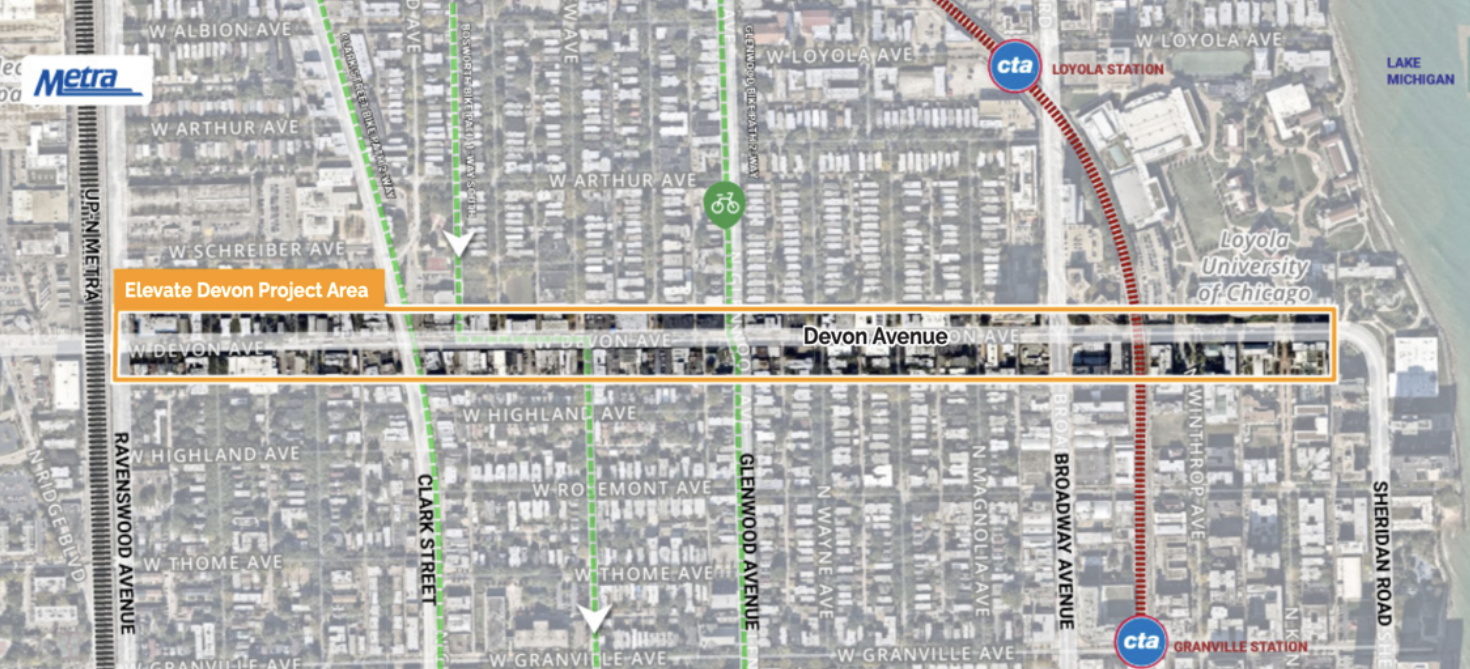 The Edgewater Chamber of Commerce, Rogers Park Business Alliance, and Loyola University Chicago have released the Elevate Devon Corridor Plan, “a strategic plan for the vibrant avenue in Rogers Park and Edgewater.” The plan focuses on the one-mile stretch of Devon Avenue between Sheridan Road and Ravenswood Avenue, bordering the neighborhoods of Rogers Park and Edgewater. I reviewed the document and spoke to Sandi Price, the executive director of the Rogers Park Business Alliance, to see what the plan might mean for residents and visitors, especially those who travel by foot, bike, and transit.