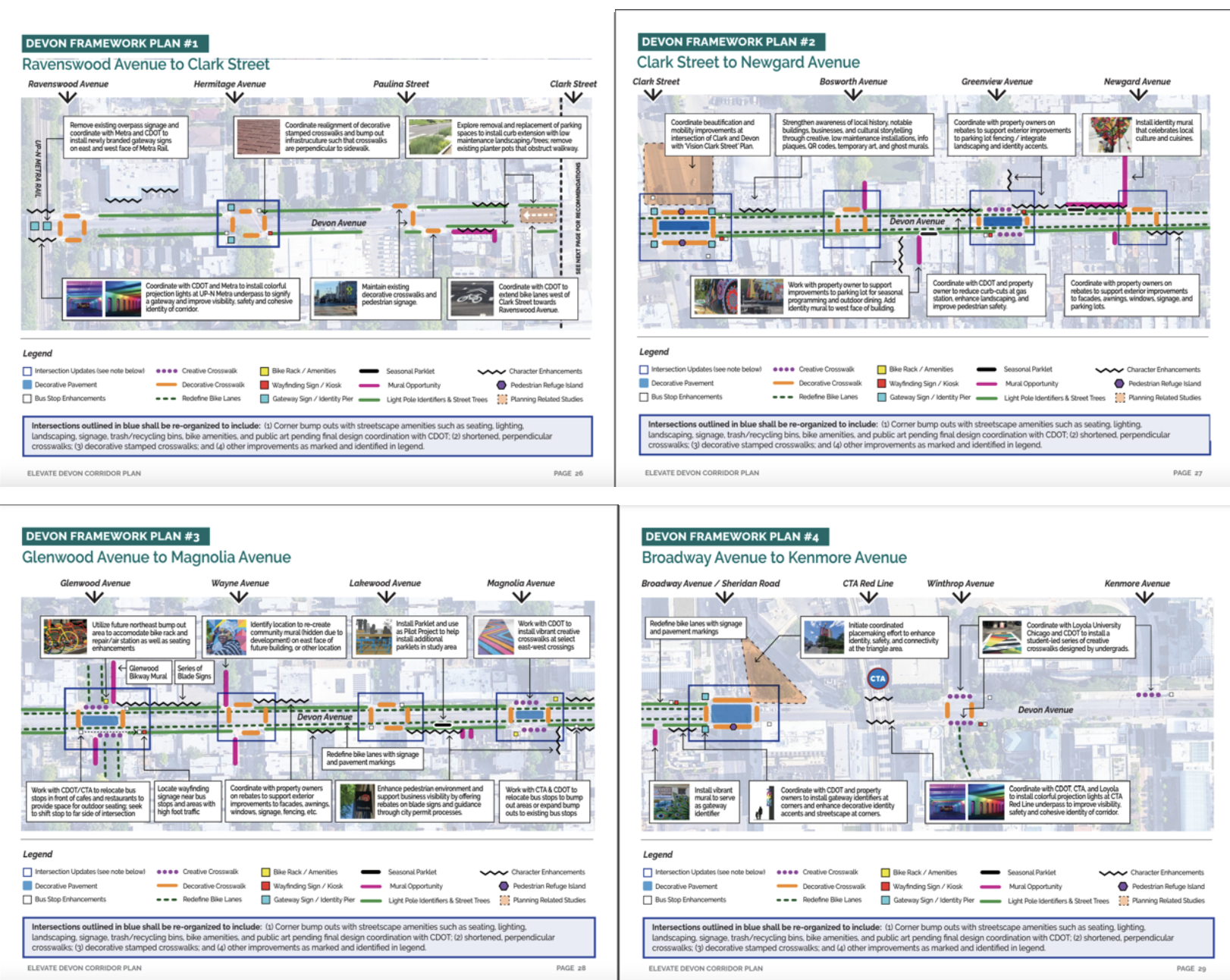 The framework plan recommends, essentially, placemaking improvements and road diet strategies along Devon Avenue: corner sidewalk bump-outs, street furniture, decorative signage, a wayfinding kiosk, decorative pavers, murals, decorative lighting, bus stop enhancements, bike amenities, bike lane extensions. It calls for 49 improved crosswalks (“Creative Crosswalks” and “Decorative Crosswalks”), three new pedestrian islands at especially wide crossings, 22 bike rack and amenities stations, seven wayfinding stations (new signage or kiosk), and ten key “Intersection Updates.” These intersections have been revamped to include corner bump-outs, shortened and decorative crosswalks, and added streetscape amenities like seating, lighting, artwork, and landscaping.