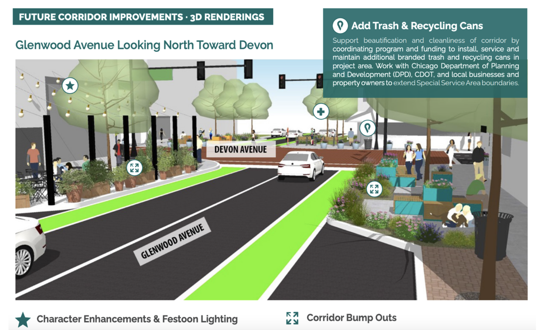 The Elevate Devon Corridor Plan, if implemented, will improve pedestrian and cyclist safety and experience of Devon Avenue and likely bring more business to the area. The proposed changes and upgrades would reduce the ROW space dedicated to cars and give more space to people, expanding the public realm to be more engaging, safe, and representative of what the community wants this corridor to be.