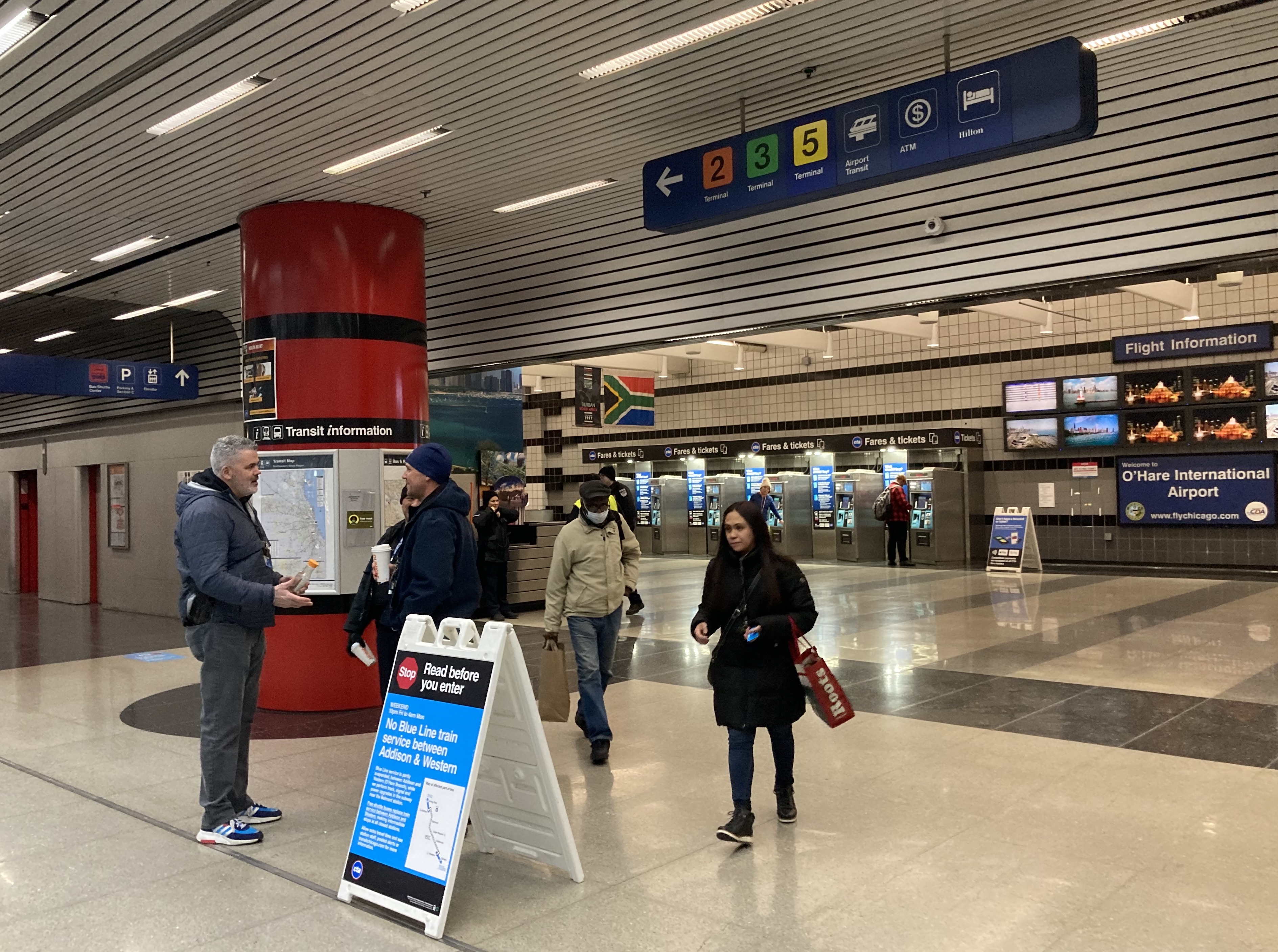 When I flew into the airport around on February 25 around 11 p.m., after Lightfoot announced the camping ban, I'd seen a large security presence at the the train stop, but didn't notice any gates,. I also saw zero apparently homeless folks hanging out in the terminals and corridors, in contrast to the previous time I'd gone to the airport, when I saw several people sleeping on the corridor floors.