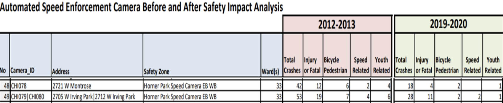 Chicago Department of Transportation data confirms that Horner Park’s speed cameras have been effective in reducing crashes. As you can see in the chart above, there were 42 total crashes within the eight-mile radius Safety Zone around the Montrose speed camera from 2012-2013, before the cam was installed, but only 18 total crashes in 2019-2020, after installation, a 57 percent reduction. Injury or fatality crashes dropped from 12 to four, decreasing by two-thirds.