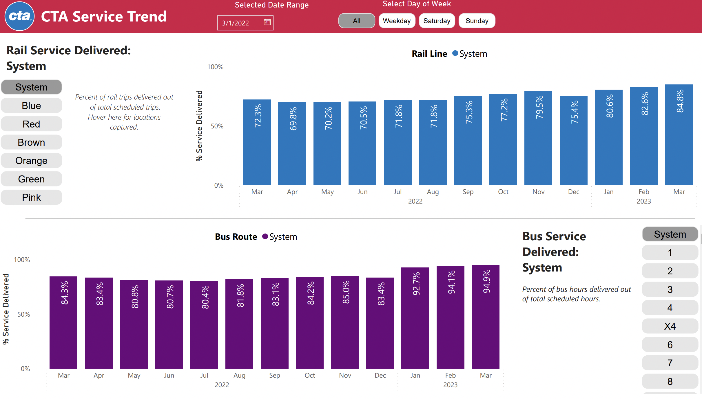 - Bus service delivered: 94.9 percent in March, versus 94.1 percent in February