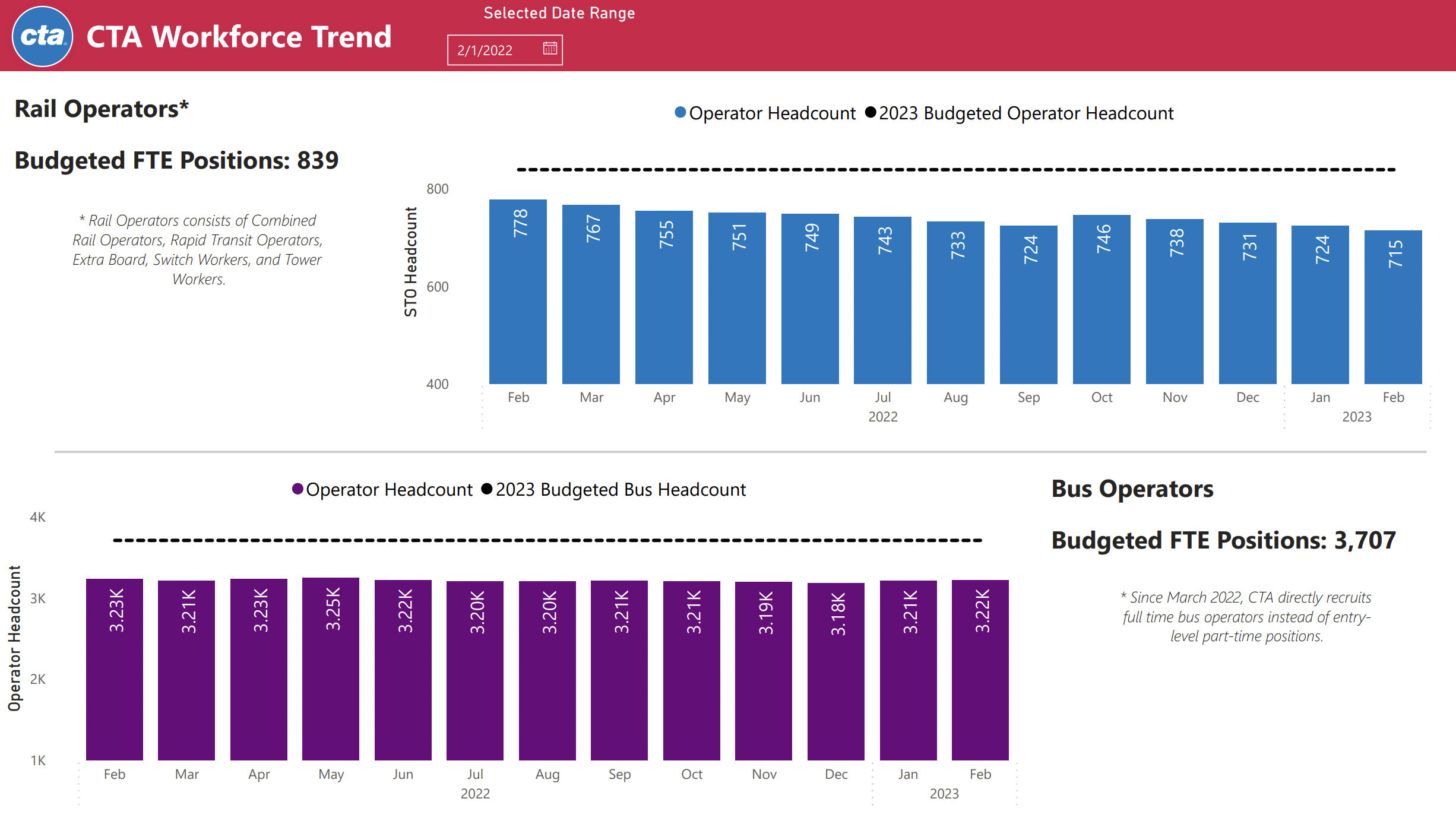 (After publication of this article, a CTA spokesperson clarified, “At the end of 2022, CTA had a deficit of almost 600 bus operators. Since then, we have successfully onboarded 225 new bus operators. The goal of 700 new bus operators will continue to lower our deficits compared to our budgeted headcount, but it will not net CTA 700 more operators by year-end due to attrition.” They also noted that while the hiring 225/700 data are through March 31st, the headcount/attrition charts are through February 28th.)