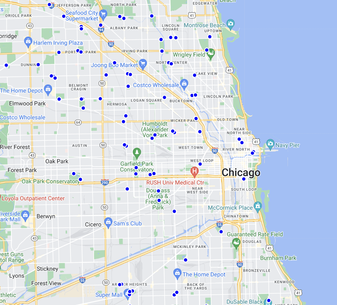 Speed cameras were removed from the eighth-mile radius Safety Zone around Mulberry Park in Bridgeport. (By state law, the cams can only be installed within Safety Zones around parks and schools.) Local alder George Cardenas (12th) had previously claimed these cameras were a cash grab because they were installed on Archer Avenue, out of sight of the small park. However, CDOT provided a crash map that showed the cams had been deployed in an effort to address a crash epidemic on Archer.