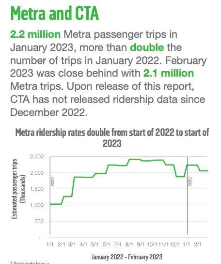 Metra also saw improvement—downtown trips steadily ticked upward, doubling since January 2022. The CLA report does not offer a 2019 benchmark—which would be significantly above current levels—but more people on trains is always good news.