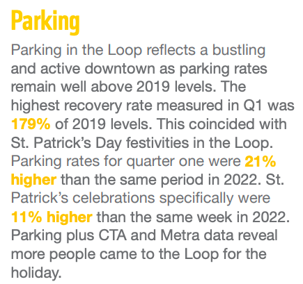 Nonetheless, it’s clear that a growing number of visitors to the Loop are choosing to travel by car. Streetsblog has been following these reports and sounding the alarm on literally off-the-charts parking levels, as many folks left public transportation and bought cars out of concern about exposure to Covid-19. Though the pandemic is now waning, high car use has sadly remained. The CLA report states that parking levels reached a staggering 179 percent of the same time in 2019. Yes, nearly twice as many personal vehicles are clogging the Loop now than before the pandemic. Distressingly, this peak coincided with St. Patrick’s Day weekend, an alcohol-soaked holiday when merrymakers should be accessing the Loop via any other mode than private cars.