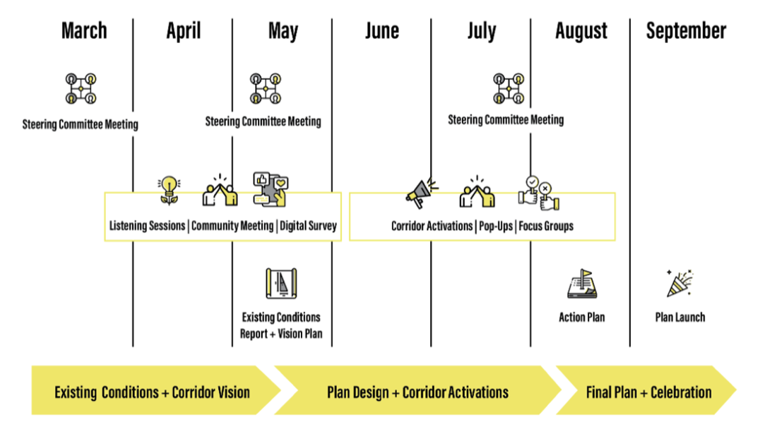 The project seems to be mostly a planning process that is focused on public and stakeholder engagement, with the goal of producing a community-supported action plan to bolster economic recovery. Project representatives cited collaboration and commercial revitalization as focuses.