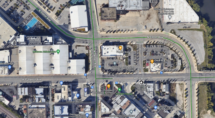 Going southbound on Damen at the Elston intersection, the bike lane should feature a painted bike box (similar what exists at Damen/North/Milwaukee in Wicker Park) so bike riders can get a little ahead of the stopped drivers. And the painted green bike lane needs to shift to between the left and right lanes, so that the vast majority of southbound drivers who are turning right onto Fullerton don’t get in conflicts with the cyclists and keep traffic flowing. Make the right hand lane a turn-only lane because drivers continuing south have to move left anyway due to the parking lane on Damen south of Fullerton.