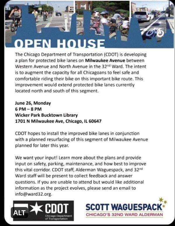 CDOT is holding an open house about the new protected lane plan next Monday, June 26 from 6-8 PM at the Wicker Park Bucktown Library, 1701 N Milwaukee Ave. “The intent is to augment the capacity for all Chicagoans to feel safe and comfortable riding their bike on this important bike route,” said a flier for the event. “This improvement would extend protected bike lanes currently
