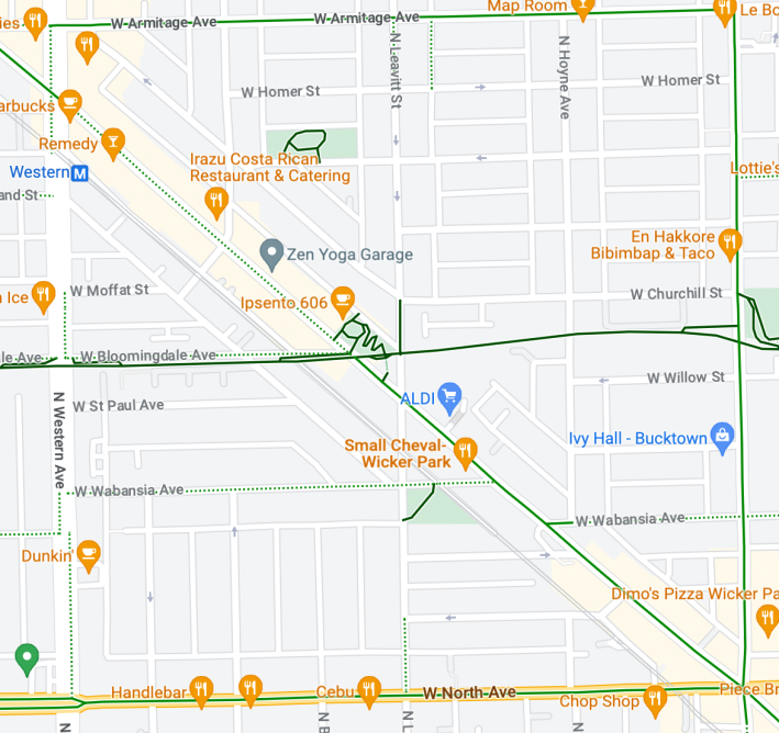 If the plan goes through, roughly a mile of Milwaukee in Wicker Park south of North would still lack protection. But the avenue basically has protected lanes for its entire length between Division Street and its southern terminus at Kinzie Street and Milwaukee Avenue. The new protected lanes, which would be part of a repaving project planned for later this year, would also provide access to the Bloomingdale Trail, AKA The 606, near Leavitt Street.