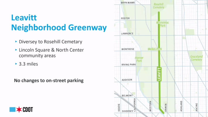The greenway will be implemented along the 3.3 mile stretch of Leavitt Street from Diversey Parkway to Rosehill Cemetery, connecting the North Center, Lincoln Square, and Bowmanville neighborhoods. Huff noted that there would be no change made to on-street parking along the route.