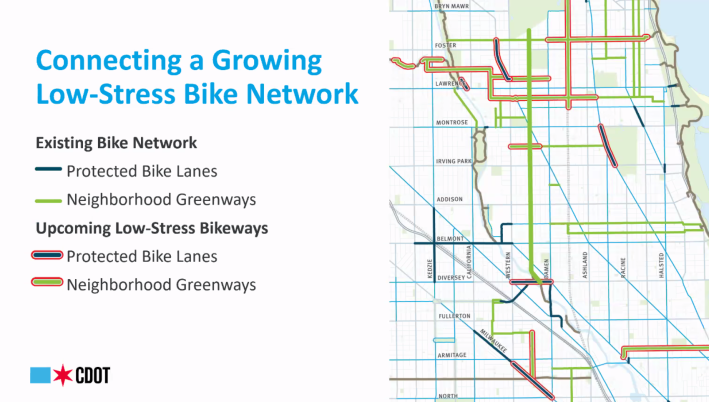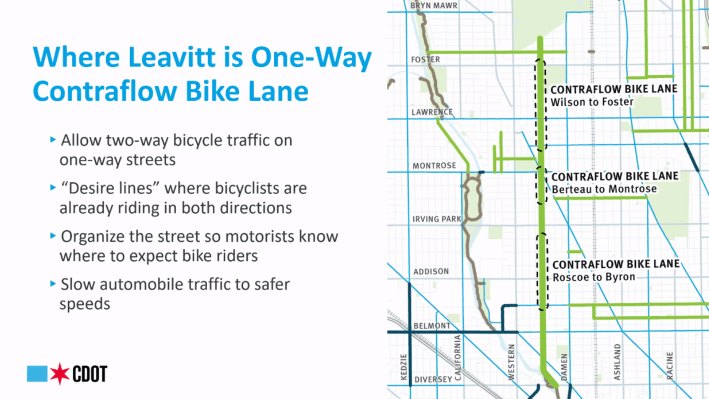 On Monday evening, Chicago Department of Transportation staff and representatives from the 32nd, 40th, and 47th ward offices presented details for the planned Leavitt Street Neighborhood Greenway project to a virtual audience of roughly 90 people. The project will represent an earnest push towards creating additional “low stress” corridors and improve safety for bicyclists, pedestrians, and drivers, Brad Huff, manager of the Complete Streets program at CDOT told the audience.