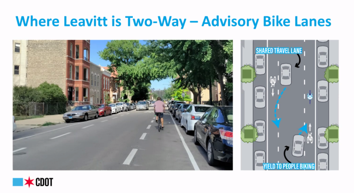 While Leavitt is a one-way street through much of the 3.3 mile stretch that will become the greenway, the project will feature two-way bike lanes on sections of the street that are two-way. Vehicles will share a travel lane in the center of the road, which will be flanked by separate “advisory” bike lanes going in each direction.