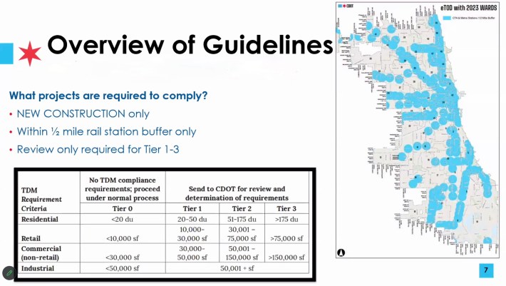 On Tuesday, the Chicago Department of Transportation hosted a webinar providing an overview and guidelines for compliance with Travel Demand Study and Management Plan (TDM) requirements. Those guidelines are required for new construction project owners in B, C, and D zoning districts near train stations to meet Connected Communities Ordinance requirements. The webinar was hosted by Bill Higgins, the CDOT project manager in charge of the Public Ways policy group, which is part of the project development division at CDOT.