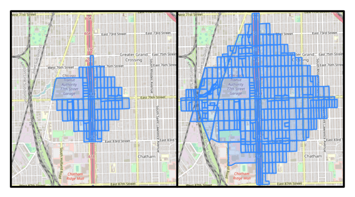 My analysis uses CTA-provided ridership data and block-level 2020 US Census data to find the population within an estimated grid walking distance of each “L” station. For example, if we look at the 79th Street Red Line station, we can calculate the population within a half mile to be 3,843, and the population within a mile to be 16,976. The question is: which of these areas should be considered the “service area” of that station for the purposes of development?
