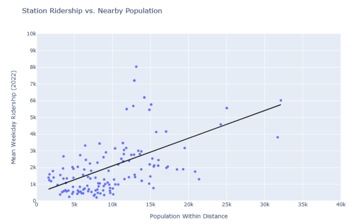 The total population living in a given area for each train station can be compared to the station’s ridership to assess what area best describes where people are actually traveling from to ride transit. There are limitations to this approach, since not all ridership is driven by residential density, and stops like airports, park and ride-heavy end-of-line stops and non-operational stops have been excluded from the analysis to try and account for this effect. However, we can still get a much better idea of how surrounding land use and transit ridership are linked than we could by just guessing.